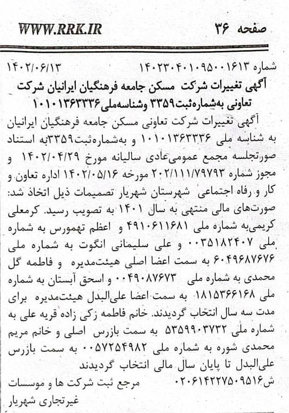 تعاونی مسکن جامعه فرهنگیان ایرانیان تحت شماره 3359 و به شماره ملی 10101363336 و شماره اقتصادی 4111548883436 تحت نظارت اداره کل تعاون کار و رفاه احتماعی شهرستان شهریار و اتحادیه تعاونی های مسکن فرهنگیان استان تهرن مشغول فعالیت می باشد.